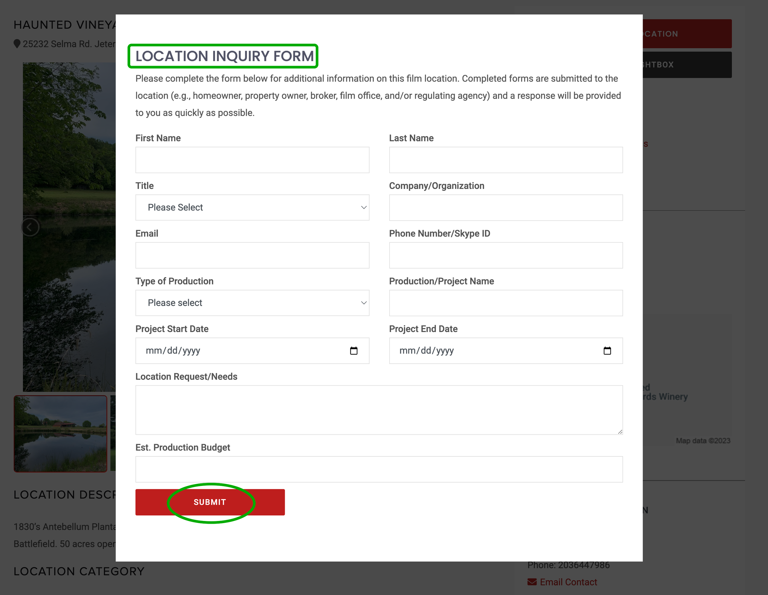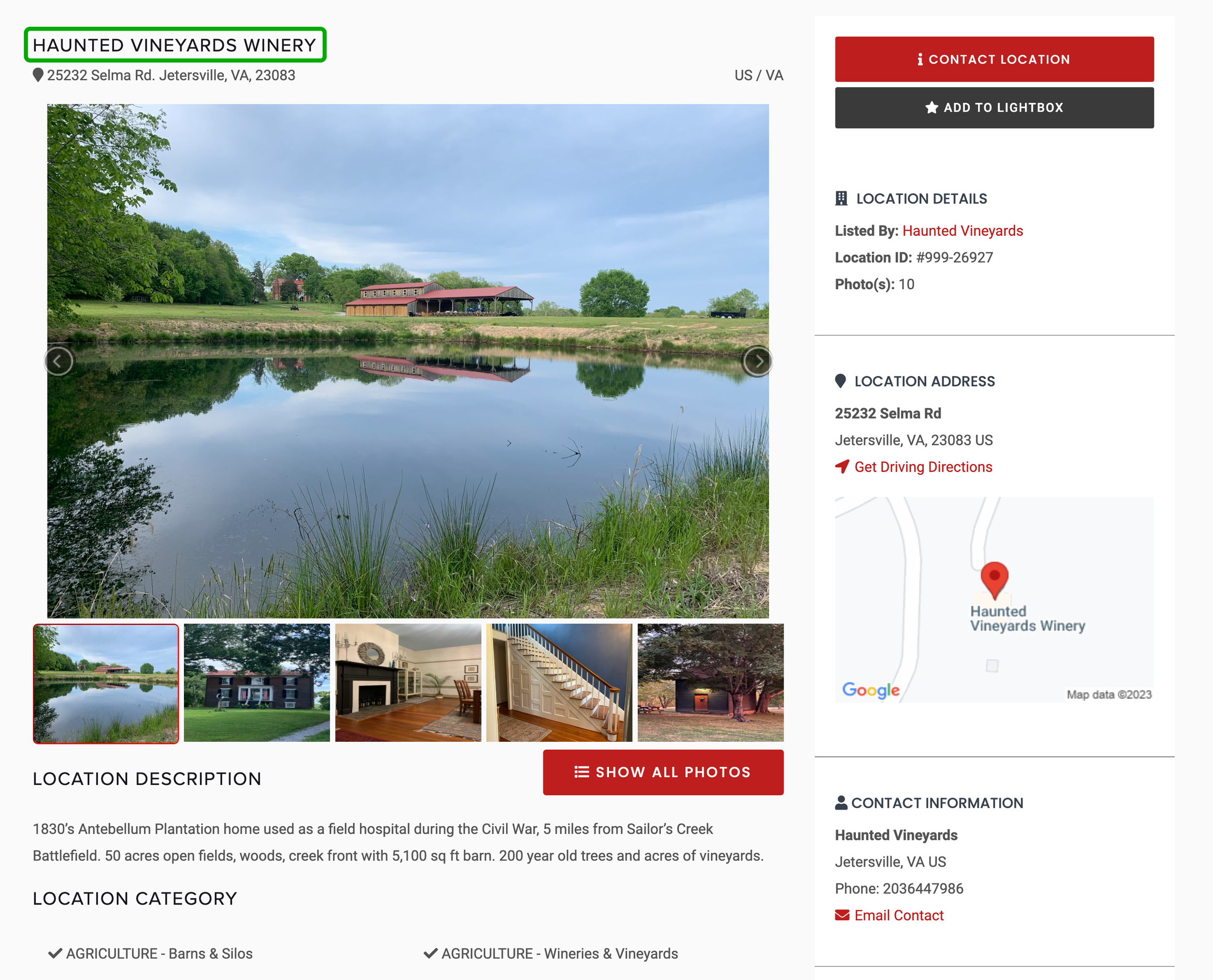 If you’re interested in getting more information on filming at Haunted Vineyards Winery, simply click on the red “CONTACT LOCATION” button in the upper right corner of the listing. Alternatively, you can also click on the “Email Contact” link at the bottom right.